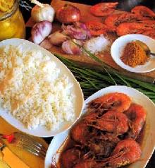 -Laver et décortiquer les crevettes. -Hacher finement les oignons. Piler les épices (ail, gingembre) -Couper les tomates en petits morceaux. -Verser l'huile dans une cocotte, et roussir les oignons. Ajouter les épices pilées et le thym. -Jeter les tomates dans la cocotte avec le curcuma. Laisser cuire à feu vif quelques minutes, puis verser les crevettes. -Mélanger, ajouter deux verres d'eau. Laisser cuire à feu doux 10 à 15 minutes. Veiller à ce que la sauce ne réduise pas entièrement. |